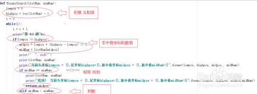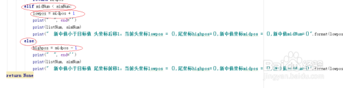 def BinarySearch(listNum, aimNum): lowpos = 0 highpos = len(listNum) - 1 print("当前头坐标:lowpos = {}, 从头至尾坐标 highpos={}".format(lowpos, highpos)) i = 0 while(1): i = i + 1 print("第 %d 趟"%i) if(lowpos <= highpos): midpos = lowpos + (highpos - lowpos) // 2 midNum = listNum[midpos] print(" ", end='') print(listNum, aimNum) print("当前头坐标lowpos = {},从头至尾坐标highpos={},新中值坐标midpos = {},新中值midNum={}".format(lowpos, highpos, midpos , midNum)) if midNum == aimNum: print(listNum, aimNum) print("找到! 当前头坐标lowpos = {},从头至尾坐标highpos={},新中值坐标midpos = {},新中值midNum={}".format(lowpos, highpos, midpos,midNum)) return midpos elif midNum < aimNum: lowpos = midpos + 1 print(" ", end='') print(listNum, aimNum) print(" 新中值小于方针值 头坐标后移1:当前头坐标lowpos = {},从头至尾坐标highpos={},新中值坐标midpos = {},新中值midNum={}".format(lowpos, highpos, midpos,midNum)) else: highpos = midpos - 1 print(" ", end='') print(listNum, aimNum) print(" 新中值小于方针值 从头至尾坐标前移1:当前头坐标lowpos = {},从头至尾坐标highpos={},新中值坐标midpos = {},新中值midNum={}".format(lowpos, highpos, midpos,midNum)) return None