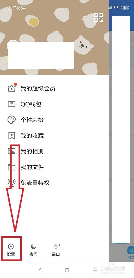 首先我们我们打开手机qq,进入手机QQ的本家儿页面,然后左滑,在左下角有一个设置选项。