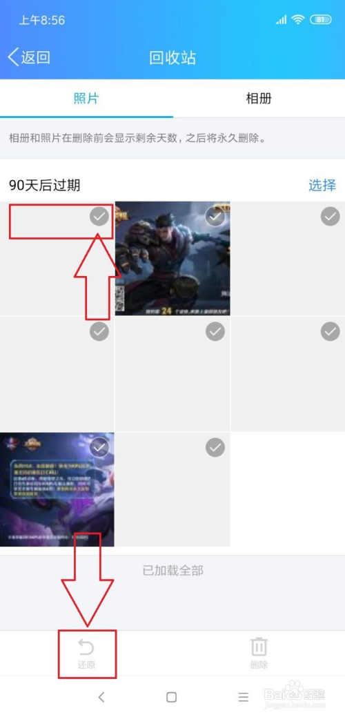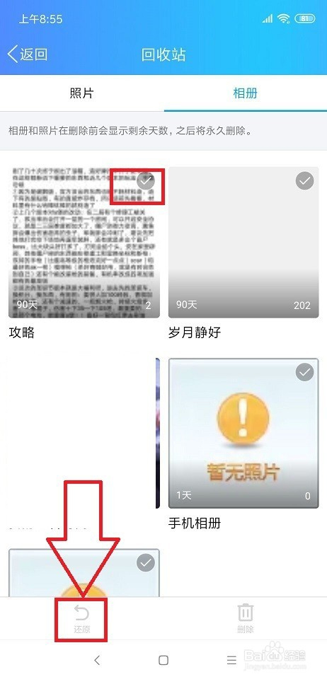 在这里我们可以看到我们以前曾经删除过的的照片,还有相册。在所需要收受接管的照片的右上角图标有一个小图标,然后我们选中这个小图标,然后再点击下面的还原。