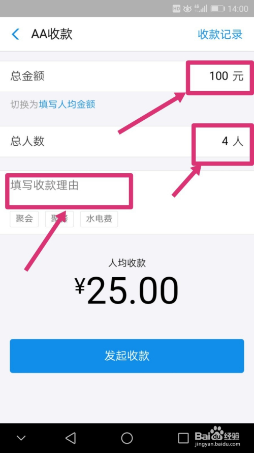 然后会进入到AA收条目的数据填写内容,包罗总人数(包罗本身)、总金额以及收条目来由,依次将这些信息填写完当作,在页面底部会主动计较人均收费额,最后点击“倡议收条目”。