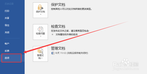 然后在菜单界面中,点击左下角的选项,进入Word选项界面中,如图所示。