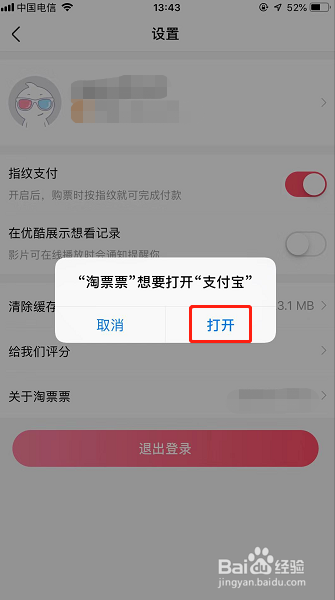 开启右侧滑块后,屏幕上弹出淘票票想要打开支付宝的对话框,点击对话框上的【打开】,如图所示!