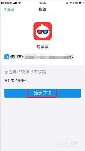 然后页面跳转到支付宝指纹支付授权页面,点击页面下的【确定开通】,如图所示!