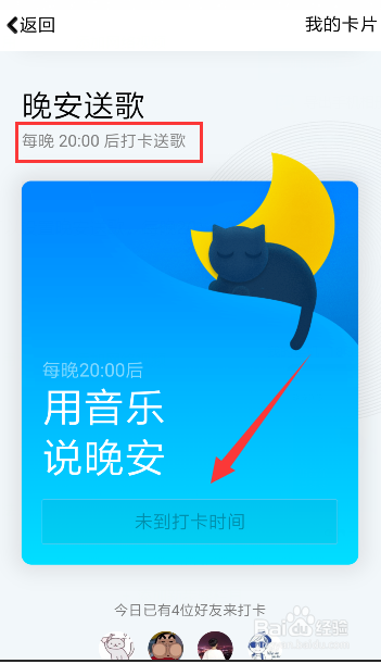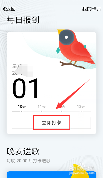 别的,你也可以设置晚安送歌,每晚20:00后,可以打卡,如图所示