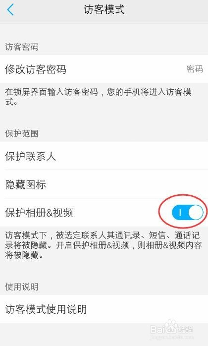 返回访客模式页面,在【庇护规模】打开“庇护相册和视频” 。