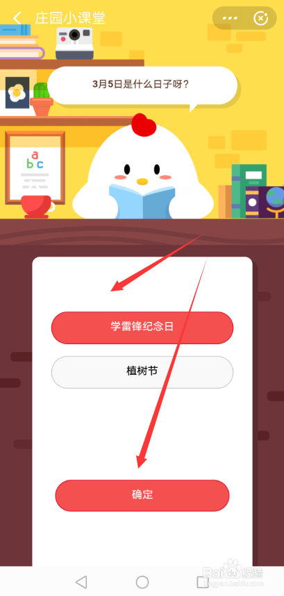 在庄园小讲堂里就可以看到3月5日是什么日子?下面有2个选项,当然3月5日是学雷锋纪念日了,选中后,直接点击确定,如下图所示。