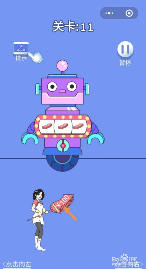 第11关点击机械上的三个图案,让三个图案都酿成钱的图案,然后点击地上的钱就过关了。