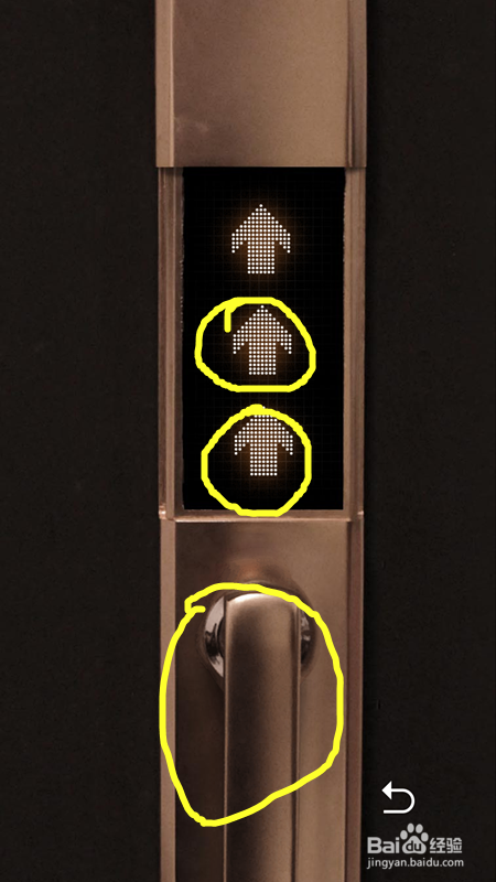我们点击墙壁上的丹青,按照这幅图手指指的偏向,然后我们点击门把手,按照手指指的上摆布,再点击门把手打开门。