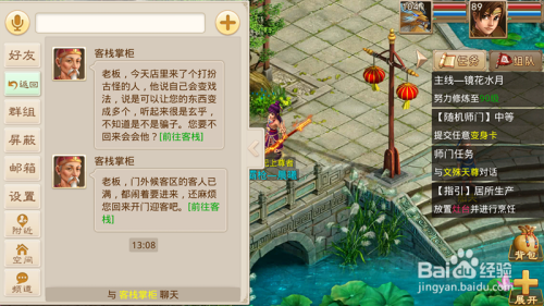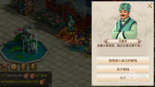首先我们去天墉城,找到天墉城的冯喜来,点击冯喜来,进入我本身的客栈,如下图所示。