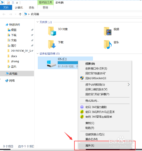 右键点击系统盘,一般为C盘,点击“属性”,打开系统盘的属性界面