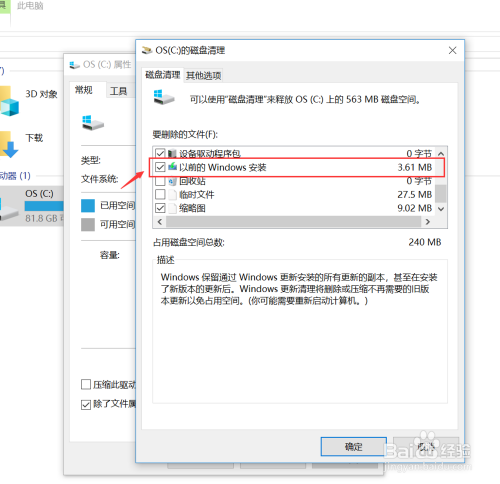 在“磁盘清理”界面的“要删除的文件”列表中,勾选“以前的windows 安装”