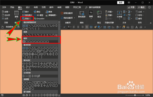 在“插图”选项组里面找到“外形”,打开外形的下拉选项,在此中的矩形项目组里面找到并选择一个合适的矩形。