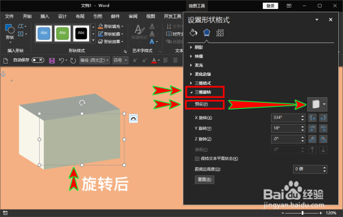 三维格局设置完当作后,我们并不克不及较着看到长方体的样式,所以我们需要在“三维格局”下面的“三维扭转”菜单中将我们的长方体进行扭转,可以直接选择预设中的扭转样式,也可以鄙人面自界说设置扭转角度。