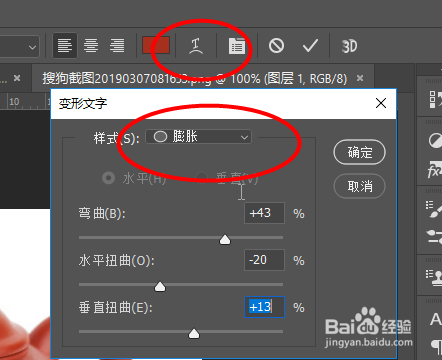 接着选择样式变形,选择膨胀变形,调整下方三个参数,让文字与壶面相顺应