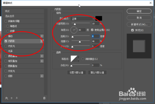 接着右键选择夹杂选项,然后勾选内暗影,调整不透明度和距离,然后点击确定