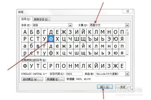 在“子集”中选择“西里尔文”,并鄙人方选中西里尔字母Ф,点击“插入”。