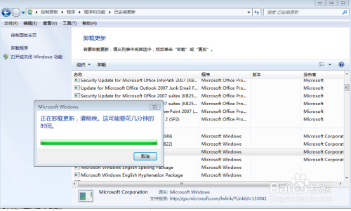 在程序和功能页面,点击“查看已安装更新”,进入已安装更新页面。