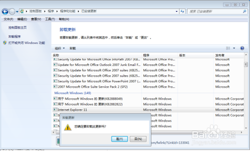这时弹出提醒窗口,你确定要卸载此更新吗,点击“是”,进行卸载。