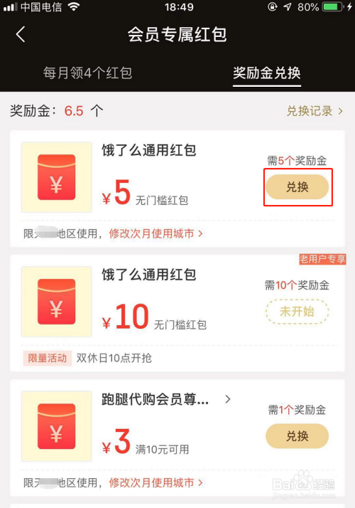 按照本身拥有的奖励金的个数兑换响应的红包,(小编拥有6.5个奖励金,以兑换5个为例)点击【兑换】按钮,如图所示!