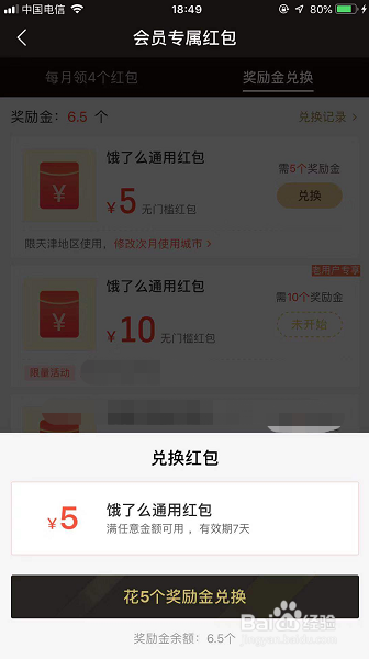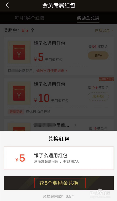 点击兑换后屏幕下方会弹出确认界面,点击【花5个奖励金兑换】完当作确认,然后兑换完当作。兑换的通用红包只有7天有用期,7天之后主动作废,所以兑换了要尽快花失落哦!
