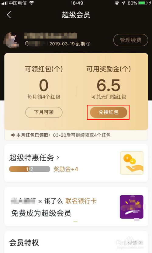 在超等会员本家儿页下,点击可用奖励金个数下边的【兑换红包】按钮,如图所示!(建议奖励金数目大于等于5个以上再进行兑换)