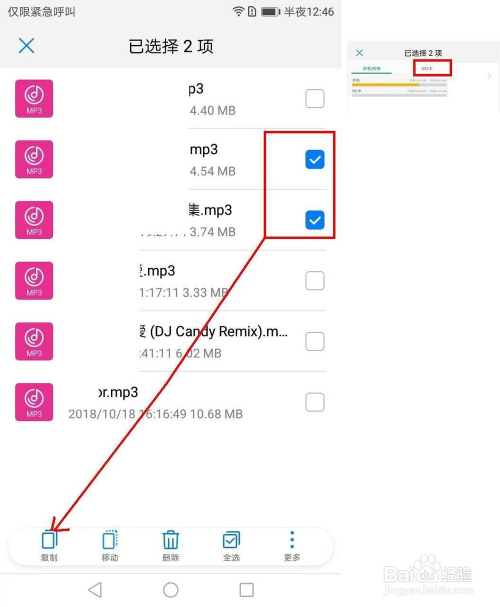 在打开的音频窗口列表中,长按某一首音乐,这时就会酿成一个个的选择框,点击勾选需要传输的音乐文件——然后点击复制,复制之后就会选择需要复制存储到一个处所,这里选择SD卡。