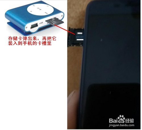 第一种环境就是插入存储卡式的MP3,可以把存储卡弹出来,再把它装入到手机的卡槽里,然后关紧卡槽。