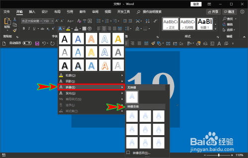 - 在word中倒影被称之为映像,可以在开始菜单下的文字结果和版式中进行设置;