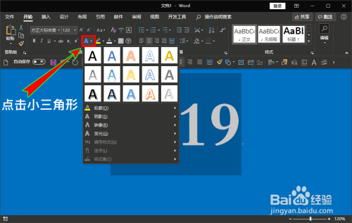 在“字体”选项组里找到“文字结果和版式”功能按钮,然后点击该功能按钮旁边的小三角形,打开其下拉菜单。