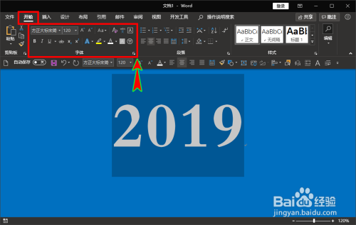 输入完当作后选中文字内容,在word软件顶部的菜单栏中选择“起头”菜单,然后在“起头”菜单下找到“字体”选项组。