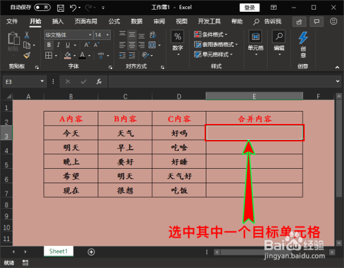 打开Excel软件,我们进入需要归并内容的Excel表格。好比此刻我们是要将表格中的每一行B-D列的内容归并到同业右侧的空白单位格中,该怎么弄呢?首先我们先选中表格第一行右侧的空白单位格,也就是方针单位格。如图所示: