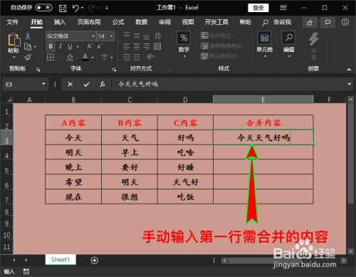 接着我们在选中的空白单位格内,手动输入第一行B-D列的内容,即需归并的内容。如图所示: