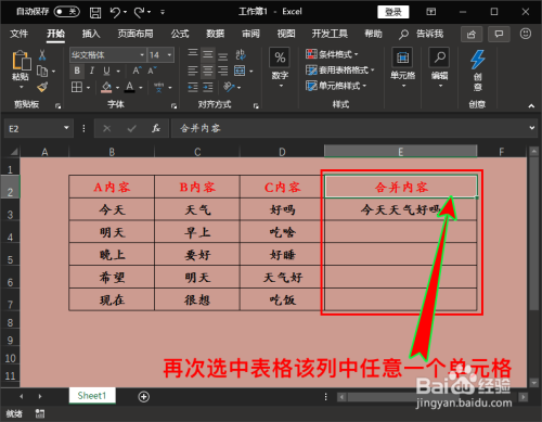 表格第一行归并的内容输入完当作后,我们再次选中表格该列中肆意一个单位格。然后再同时单击键盘上“Ctrl”键+字母“E”键。如图所示: