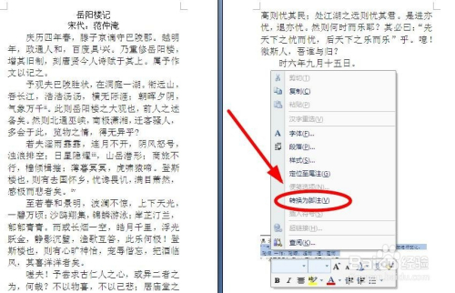 若是需要将个体的从头至尾注进行转换,先选中要转换的从头至尾注,利用鼠标右键,选择“转换为脚注”单击即可