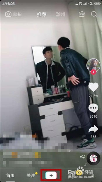 首先打开抖音,然后点击底部的【+】按钮,如图所示。