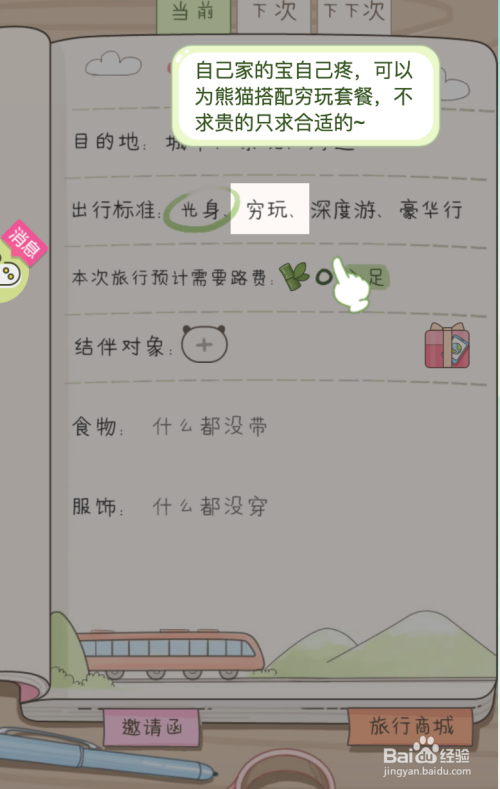 然后回到旅游界面上,点开“旅游”进行选择旅游体例,起头因为经验不足,只能选择“穷游”,进行观光。