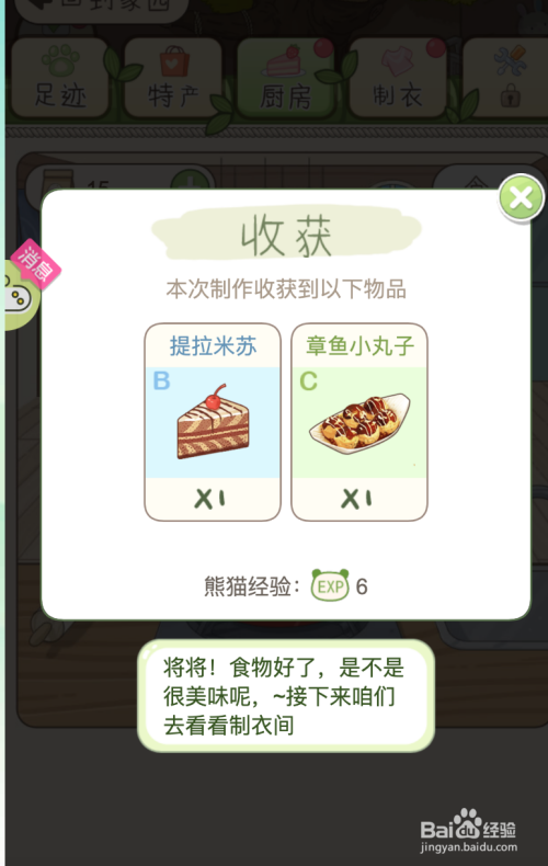 颠末遴选建造后,收成如下图所示,一个提拉米苏、一个章鱼小丸子。接下来看图示提醒框中的文字,要去制衣间建造衣服了。