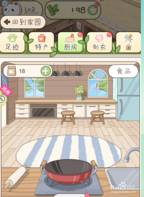 然后点厨房,则游戏界面即可带你走进厨房,你可以自由选择食物建造食物,为观光所带食物做筹办。