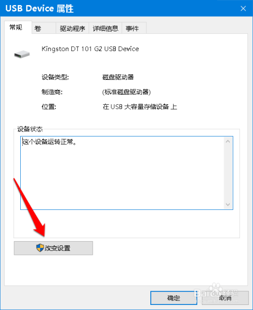 在USB 属性窗口中,我们点击:改变设置;