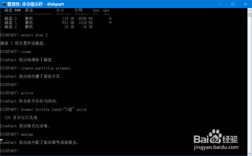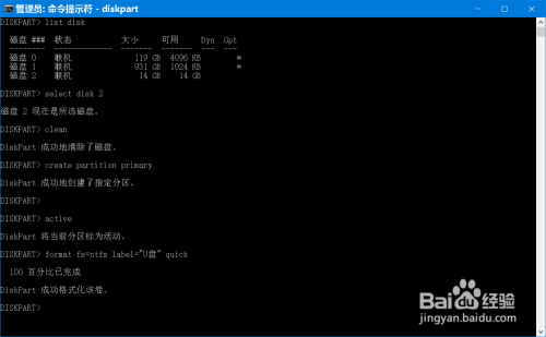 format fs=ntfs label=”U盘” quick