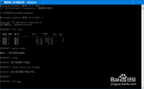 号令到办理员号令提醒符窗口中(注重:不需要按回车键),此时会显示:diskpart 当作功建立了指定分区,且鄙人一行显示了 active 号令;