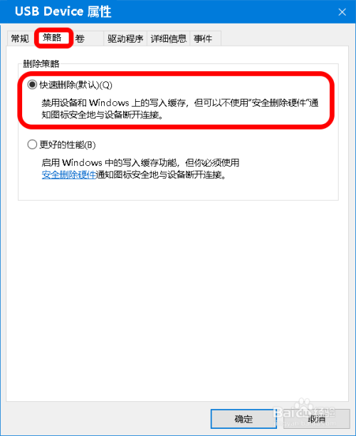 我们将删除策略从 快速删除 更改为 更好的机能,再点击:确定;