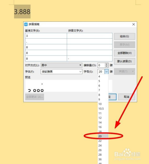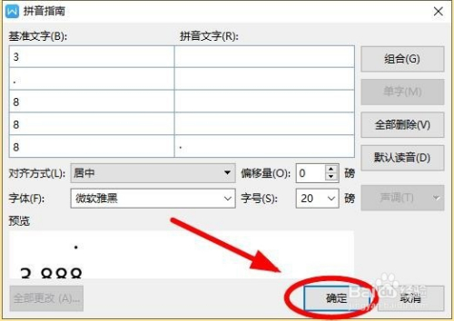 在“拼音指南”对话框,把光标放置在最后一个“8”对应的拼音文字后面的位置,点击鼠标右键"粘贴”,或者利用输入法的“特别符号”功能输入“•”到拼音文字的窗口中
