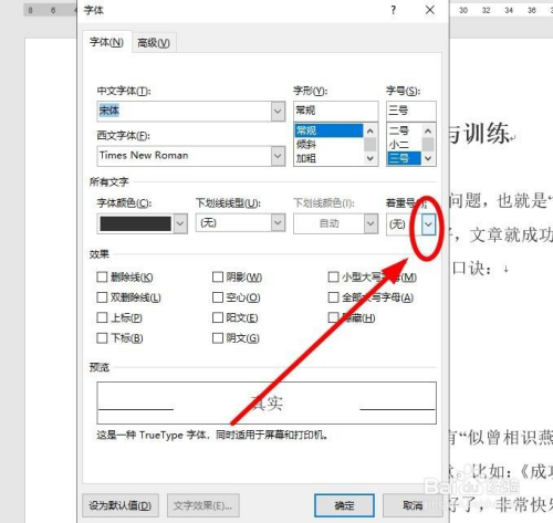 在弹出的“字体”对话框中,找到“着重号”下面的选择框后面的下拉箭头单击