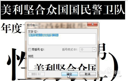 在弹出的“双行合一”对话框中的“文字”一栏中进行查对→在确认无误后,可以“预览”中的结果为准并点击确认即可。