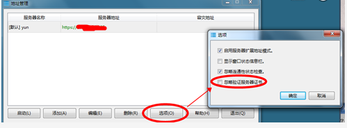 在选项窗口中—勾选忽略验证办事器证书,点击确定按钮。