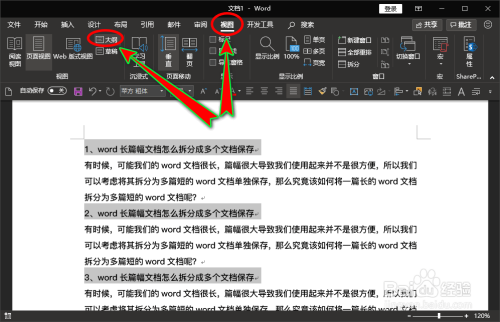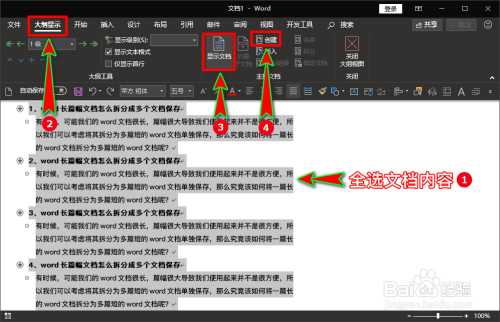 接着我们先全选文档中的所有内容,然后继续在“纲领显示”菜单里找到“本家儿控文档”选项组,在选项组里找到并点击“显示文档”功能,点击后右侧会显示出“建立”菜单,我们点击该菜单项。