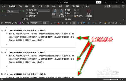 点击“建立”之后,就可以看到word文档中的内容按我们选择的拆分点被拆当作多个部门了,此时我们只需要点击“另存为”将文档存储到电脑当地,存储好之后就可以看到长篇幅文档被拆分为多个短文档保留起来了。