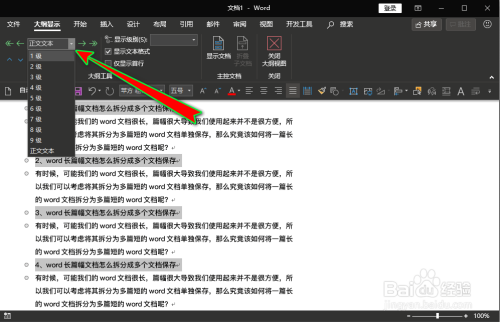 - 拆分长篇幅文档之前,我们需要先选择从文档中的哪些处所进行拆分,并将其设置为1级纲领级别;