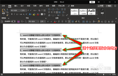 想要将文档从哪些处所进行拆分隔来,我们就在文档中,按住键盘上Ctrl键先逐个选中这些我们要拆分的位置。